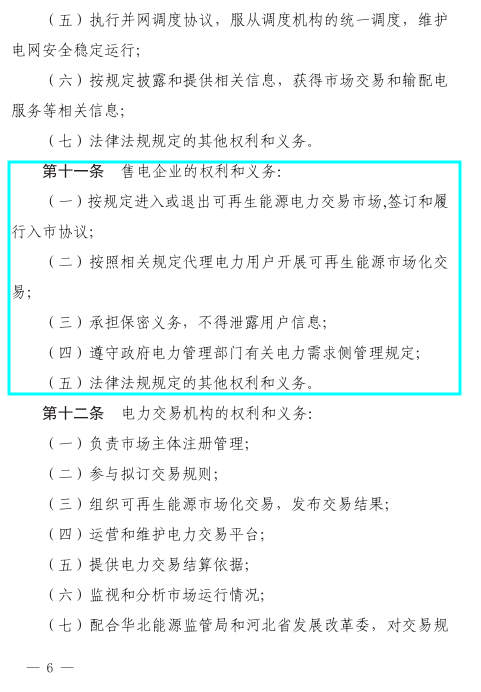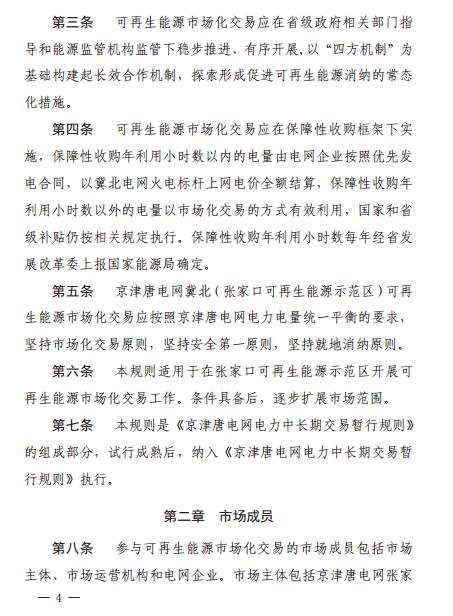 華北能源監(jiān)管局、河北省發(fā)改委日前聯(lián)合印發(fā)了《京津唐電網(wǎng)冀北(張家口可再生能源示范區(qū))可再生能源市場化交易規(guī)則(試行)》特急文件。規(guī)則中所稱可再生能源市場化交易,主要是指準入的電力用戶與并網(wǎng)可再生能源發(fā)電企業(yè),對保障性收購年利用小時數(shù)以外的電量,通過掛牌、協(xié)商、競價等市場化交易方式進行的中長期電量交