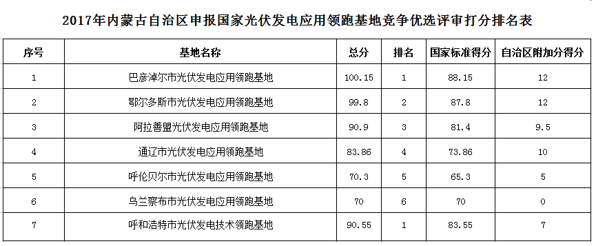 2017年內(nèi)蒙古自治區(qū)申報(bào)國(guó)家光伏發(fā)電應(yīng)用領(lǐng)跑基地競(jìng)爭(zhēng)優(yōu)選評(píng)審打分排名表。