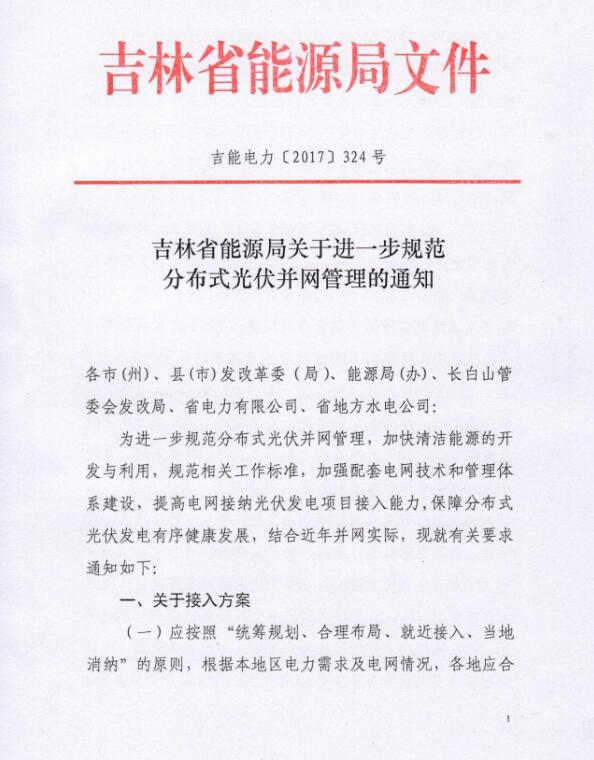 吉林省能源局關(guān)于進(jìn)一步規(guī)范分布式光伏并網(wǎng)管理的通知