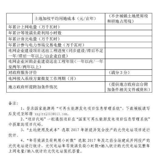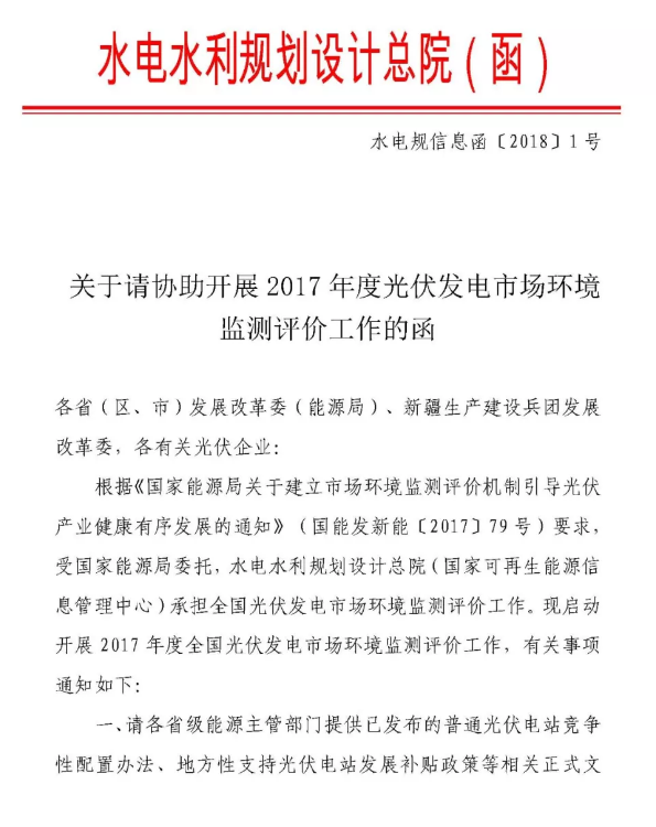 根據(jù)《國家能源局關(guān)于建立市場環(huán)境監(jiān)測評價(jià)機(jī)制引導(dǎo)光伏產(chǎn)業(yè)健康有序發(fā)展的通知》(國能發(fā)新能〔2017〕79 號)要求,受國家能源局委托,水電水利規(guī)劃設(shè)計(jì)總院(國家可再生能源信息管理中心)承擔(dān)全國光伏發(fā)電市場環(huán)境監(jiān)測評價(jià)工作。現(xiàn)啟動(dòng)開展 2017 年度全國光伏發(fā)電市場環(huán)境監(jiān)測評價(jià)工作。歡迎光伏投資企業(yè)登錄“國家能源局可再生能源發(fā)電項(xiàng)目信息管理系統(tǒng)”,下載模板填寫后發(fā)送至國家可再生能源信息管理中心郵箱xxglxz2013@163.com。以下是通知原文: