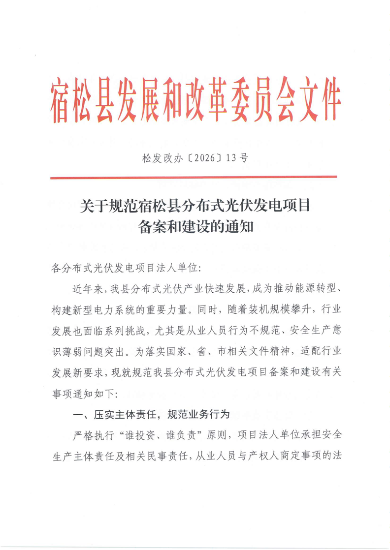 2月24日,安徽省宿松縣發(fā)改委印發(fā)《關(guān)于規(guī)范宿松縣分布式光伏發(fā)電項目備案和建設(shè)的通知》,通知要求,嚴格執(zhí)行“誰投資、誰負責”原則,項目法人單位承擔安全生產(chǎn)主體責任及相關(guān)民事責任,從業(yè)人員與產(chǎn)權(quán)人商定事項的法律責任、義務(wù)由授權(quán)企業(yè)全額承擔。從業(yè)人員開展合作洽談、產(chǎn)權(quán)證明辦理等業(yè)務(wù)時,須主動出示企業(yè)相關(guān)證明、佩戴有效工作證件;未提供有效身份證明導(dǎo)致業(yè)務(wù)延誤的,責任由項目法人單位自行承擔。企業(yè)接受未授權(quán)人員開展業(yè)務(wù)的,視為自愿承擔該業(yè)務(wù)所產(chǎn)生的全部責任。