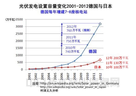 對2011年日本與德國的太陽能發(fā)電狀況進(jìn)行比較可以發(fā)現(xiàn),累計裝機(jī)容量(500萬千瓦對2500萬千瓦)以及年新裝機(jī)容量(130萬千瓦對750萬千瓦),日本都僅為德國的5分之1左右。