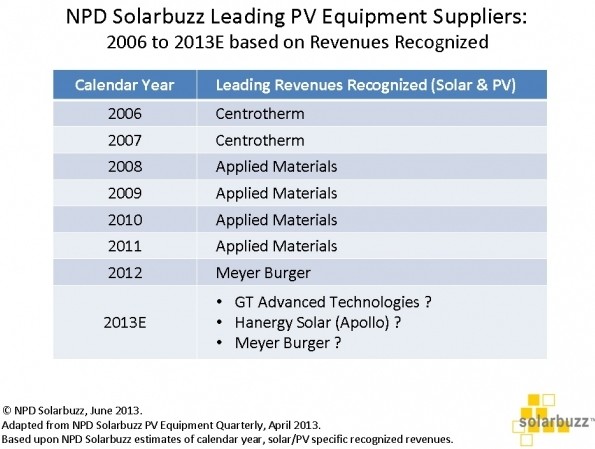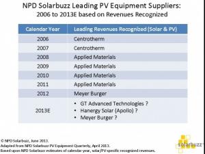 正如附表所示,Centrotherm在2006至2007年間是領(lǐng)先的光伏設(shè)備供應(yīng)商。應(yīng)用材料(Applied Materials)之后于2008至2011四年間主導(dǎo)光伏工具收入。2012年,梅耶博格(Meyer Burger)首次獲得認(rèn)可,光伏特定收入最高。2013年,領(lǐng)先的收入可能屬于GT Advanced Technologies、漢能太陽能(Hanergy Solar) (前身為Apollo Solar)或梅耶博格三者其中之一。