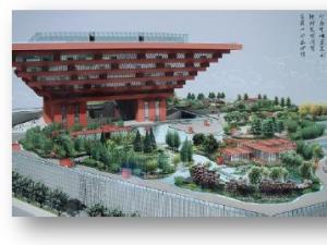 中國(guó)館暨其周邊的園林(圖一)充分具備了中華文化「天人合一」的神韻,而新九州清晏特殊之處在于:一看地面,二看小品(小雕塑),三看四周。在整個(gè)世博會(huì)中,中國(guó)館氣宇昂然(地勢(shì)最高),四方來朝,一方面飽覽山水(黃浦江),應(yīng)是最好的觀景平臺(tái)。