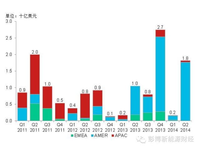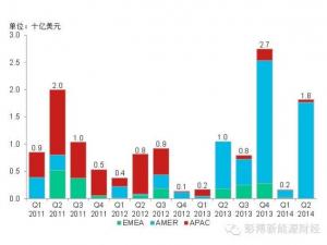 圖:全球公開(kāi)市場(chǎng)上太陽(yáng)能企業(yè)融資,2011年1季度–2014年2季度