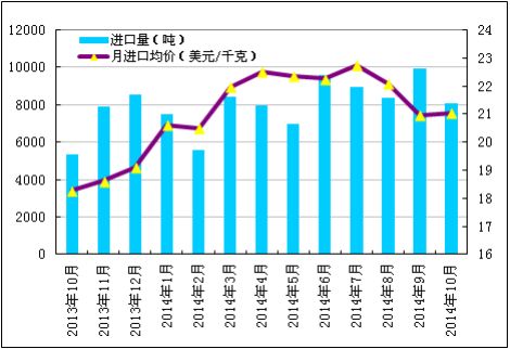 圖1 2013年10月-2014年10月多晶硅進口量及進口均價示意圖