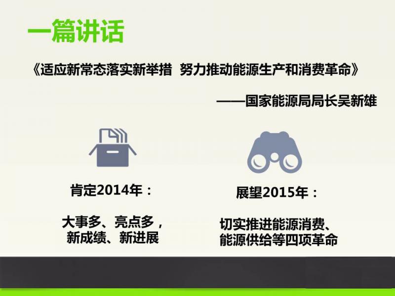 12月25-26日,全國能源工作會(huì)議在北京召開,為2015年能源工作定調(diào)。本次會(huì)議極其低調(diào)神秘,據(jù)了解只有《新聞聯(lián)播》和新華社做了報(bào)道。不過從會(huì)后放出的信息來看,硬料還是不少的,值得好好習(xí)。 國家發(fā)展改革委主任徐紹史出席會(huì)議并作重要講話,國