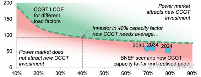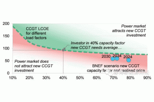 圖: CCGT capacity factors (%, x-axis) and realisedprice (EUR/MWh, y-axis) compared to levelised cost of energy (LCOE).