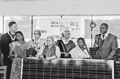 聯(lián)合國秘書長特別代表云蓋拉(右一)將太陽能板贈送給印度自主就業(yè)婦女協(xié)會