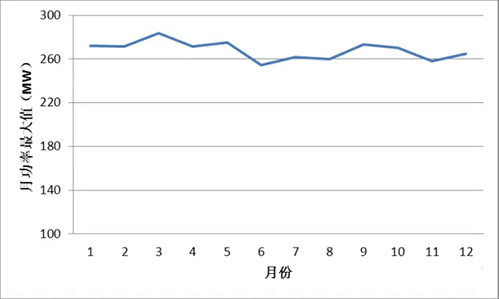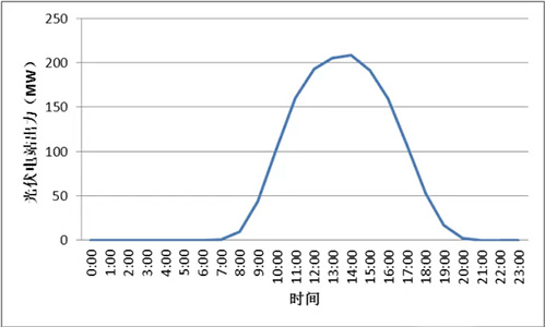光伏電站出力受太陽能資源的影響,具有規(guī)律性和波動性,格爾木地區(qū)光伏電站出力基本上分布在7:00~20:00,最大出力出現(xiàn)在12:00~15:00。陰天光伏電站出力波動較大,全年最大出力達到283.7MW,接近滿發(fā)。