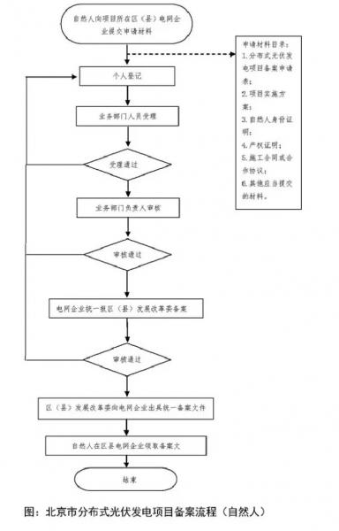 《北京市發(fā)展和改革委員會關(guān)于印發(fā)<北京市分布式光伏發(fā)電項(xiàng)目管理暫行辦法>的通知》(京發(fā)改規(guī)[2014]4號),規(guī)定了項(xiàng)目的備案流程。