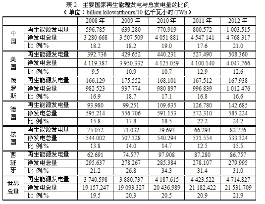 從表1和2的表述可以看出,中國(guó)可再生能源遙遙領(lǐng)先,大大強(qiáng)于美國(guó),但要注意,美國(guó)靠頁(yè)巖氣的地質(zhì)優(yōu)勢(shì),革命成功了頁(yè)巖氣;巴西甘蔗多,生物乙醇產(chǎn)量大增;中國(guó)靠的是天賜的水能,水力發(fā)電居世界第一。中國(guó)還有許多再生能源開發(fā)潛力,如小水電、海上風(fēng)電場(chǎng)、地?zé)岚l(fā)電、生物質(zhì)能、太陽(yáng)能等都不占優(yōu)勢(shì),而且按照人均平均,中國(guó)不占優(yōu)勢(shì)。能源發(fā)展不是朝向頁(yè)巖氣、可燃冰等發(fā)展,而是急劇朝向清潔能源發(fā)展,試圖減少二氧化碳排放。2012年全球再生能源發(fā)電已經(jīng)占總發(fā)電量的21.9%,2015年估計(jì)可達(dá)23%。