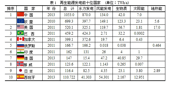 再生能源除了生物質(zhì)可以制造生物燃料以外,都是以電力來表述的?稍偕茉窗l(fā)電包括:水力發(fā)電、風(fēng)力發(fā)電、生物質(zhì)發(fā)電(包括農(nóng)林廢棄物直接燃燒和氣化發(fā)電、垃圾焚燒和垃圾填埋氣發(fā)電、沼氣發(fā)電)、太陽(yáng)能發(fā)電、地?zé)崮馨l(fā)電以及海洋能發(fā)電等。中國(guó)是世界上可再生能源發(fā)電最多的國(guó)家,而且2013年風(fēng)電場(chǎng)發(fā)電已經(jīng)超過中國(guó)核能發(fā)電量。再生能源發(fā)電前十位國(guó)家見統(tǒng)計(jì)表1。