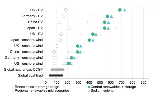 圖:2014 下半年按國(guó)家和發(fā)電技術(shù)($/MWh)以1小時(shí)的鋰離子儲(chǔ)能佔(zhàn)總產(chǎn)能的50%的度電成本