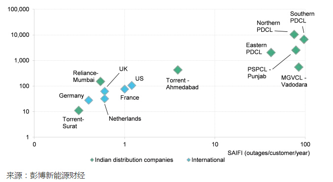 圖一:部分印度配電企業(yè)和縣市的電網(wǎng)可靠性(對數(shù)刻度)
