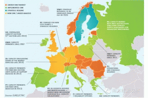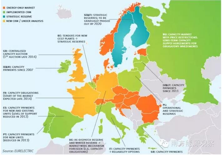 為此,人們設(shè)計了容量市場并形成了幾種不同的模式。以歐洲為例,就有法國的強制容量備用體制,西班牙的戰(zhàn)略補償體制,英國的集中容量拍賣等幾種不同的模式。在歐盟的ACER監(jiān)管中心網(wǎng)站上,我們可以找到如下的一張全歐的不同容量市場體制的分布圖。