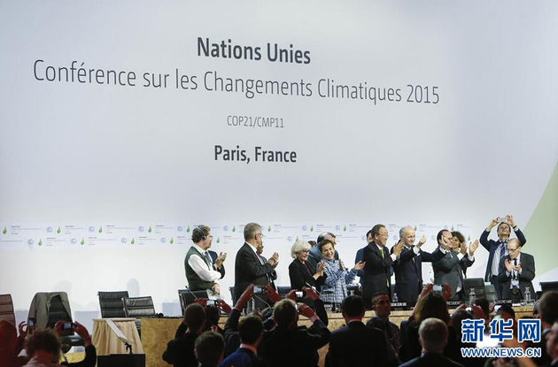 12月12日,在法國(guó)巴黎北部市郊的布爾歇展覽中心,法國(guó)外交部長(zhǎng)、巴黎氣候變化大會(huì)主席法比尤斯(右五)、法國(guó)總統(tǒng)奧朗德(右四)與聯(lián)合國(guó)秘書(shū)長(zhǎng)潘基文(右六)在巴黎氣候變化大會(huì)上慶祝巴黎氣候協(xié)議的達(dá)成。巴黎氣候變化大會(huì)12日晚通過(guò)全球氣候變化新協(xié)議。協(xié)議將為2020年后全球應(yīng)對(duì)氣候變化行動(dòng)作出安排。 新華社記者 周磊 攝 為了應(yīng)對(duì)日益嚴(yán)峻的全球氣溫升高趨勢(shì),實(shí)現(xiàn)人類(lèi)的可持續(xù)發(fā)展,巴黎大會(huì)在歷時(shí)十余天后,終于達(dá)成了協(xié)議。