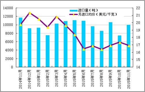 圖1 2014年11月-2015年11月多晶硅進(jìn)口量及進(jìn)口均價(jià)示意圖 數(shù)據(jù)來源:海關(guān)