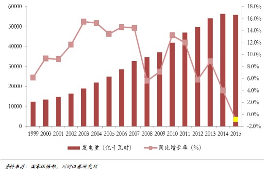 電力增長與GDP增長相關性極大,發(fā)展趨勢基本吻合。改革開放以來,我國經濟保持較快增長,取得巨大成就。與此同時,電力作為經濟增長的重要投入品,消費增速與經濟增長保持同步。按統(tǒng)計數據計算,1999~2015年我國經濟增長了7.5倍,年均增長9.4%;全社會發(fā)電量增長了4.5倍,年均增長9.8%;相關系數約為1.04。2012年進入新常態(tài)經濟以后,經濟平均年增長7.4%,發(fā)電量平均增長4.5%,相關系數約為0.6。