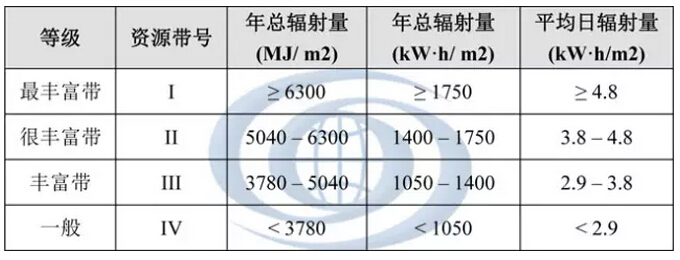 根據(jù)《太陽能資源評估方法》(QX/T89-2008),以太陽能年總輻射量為指標(biāo),對太陽能的豐富程度劃分為4個等級,如下表所示: