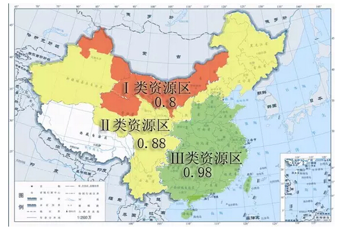 其中可以看出Ⅰ類Ⅱ類資源區(qū)在光伏電站標(biāo)桿上網(wǎng)電價上面有了大幅的下降,而各資源區(qū)所包括的地區(qū)并沒有變動,下圖可以更直觀的反映我國三類資源區(qū)的分布情況: