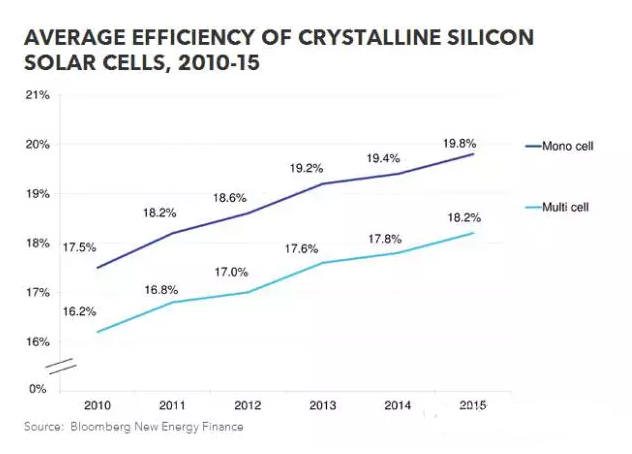 ● 2015年,多晶硅電池和單晶硅電池的效率提升了0.4個百分點,也就意味著常見的60-cell光伏模塊可以從效率提升中額外獲得6W的電力產(chǎn)出。