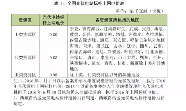 光伏電站:根據(jù)各地太陽能資源條件和建設成本,將全國分為三類太陽能資源區(qū),自2016年起逐步下調(diào)光伏電站標桿上網(wǎng)電價。