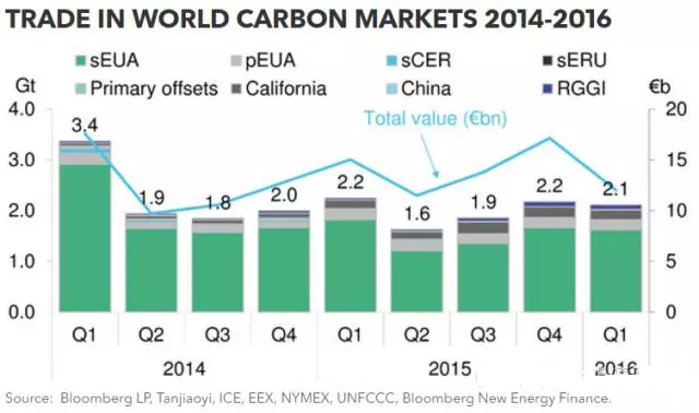 2016年第一季度,全球碳排放市場總交易量下降0.1Gt。由于碳價,特別是EU ETS(歐盟碳排放交易機制)系統(tǒng)內(nèi)的碳價下跌,全球碳排放市場的貿(mào)易值縮水51億歐元。