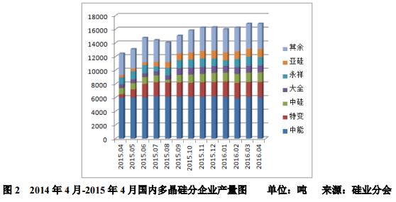 硅業(yè)分會統(tǒng)計,2016年3-4月份國內(nèi)多晶硅產(chǎn)量為3.36萬噸,同比大幅增加30.7%。3月份產(chǎn)量為1.68萬噸,4月份產(chǎn)量為1.68萬噸,其中江蘇中能的產(chǎn)量占3-4月份總產(chǎn)量的36.2%,占比有所減少,但依舊位居國內(nèi)產(chǎn)量第一位,新疆特變和洛陽中硅分別位居第二、三位,3-4月份按產(chǎn)出排序的前三大企業(yè)產(chǎn)量占總產(chǎn)量的57.5%。3-4月期間僅有少數(shù)幾家企業(yè)因技改等原因產(chǎn)能未開滿,其余企業(yè)均維持滿產(chǎn)運行,國內(nèi)多晶硅產(chǎn)量在現(xiàn)有產(chǎn)能基礎(chǔ)上已幾乎趨于極限。目前在產(chǎn)企業(yè)有16家,其中6家有效產(chǎn)能在萬噸/年以上,月均產(chǎn)量在千噸/月以上,在市場競爭中優(yōu)勢略明顯。