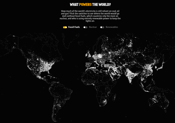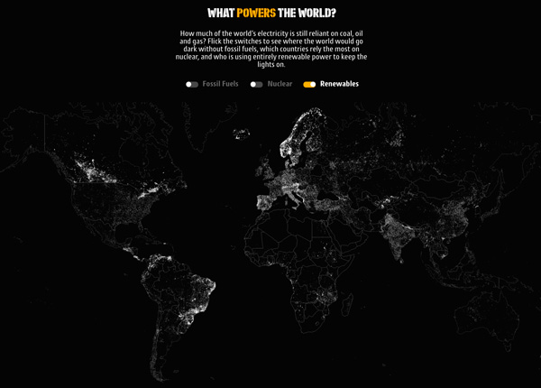 靠不同能源發(fā)電點亮的世界地圖,會是什么樣?從這個網(wǎng)站開發(fā)的世界地圖上 ( http://www.gocompare.com/energy/what-powers-the-world/ ), 你可能會找到答案。