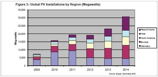 德國是最大的單一PV市場,預(yù)計2010年底安裝容量將達到8782MW。但是,明年德國的安裝容量將達到9400MW的頂點,隨后下滑。到2014年,德國的PV安裝容量將保有4500MW。