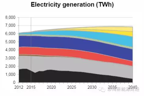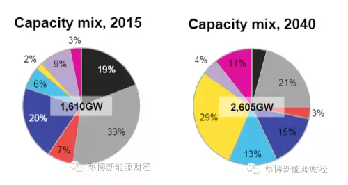 提升發(fā)電裝機(jī)容量:可再生能源發(fā)電的大規(guī)模擴(kuò)建和能源效率的提升將帶來總發(fā)電裝機(jī)容量的大幅攀升,但與此相比實(shí)際用電量只有小幅提升?傃b機(jī)容量將增長62%,從2015年末的1610GW增至2040年的2605GW。但用電量將僅僅增長10%,從6232TWh增至6850TWh。