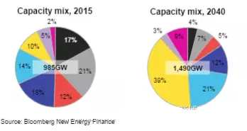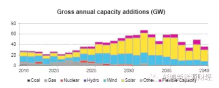 電力市場的容量與投資:在今后的25年,歐洲電力系統(tǒng)將將繼續(xù)向風(fēng)電和太陽能發(fā)電轉(zhuǎn)變。歐洲的新增發(fā)電容量總投資額達(dá)1.27萬億美元,其中風(fēng)電和太陽能融資占比86%。這些技術(shù)的發(fā)電容量占比將從2015年的24%增至2040年的60%,在959GW的新增總產(chǎn)能中,太陽能將占據(jù)一半份額,且風(fēng)電融資將占據(jù)投資總額的一半。