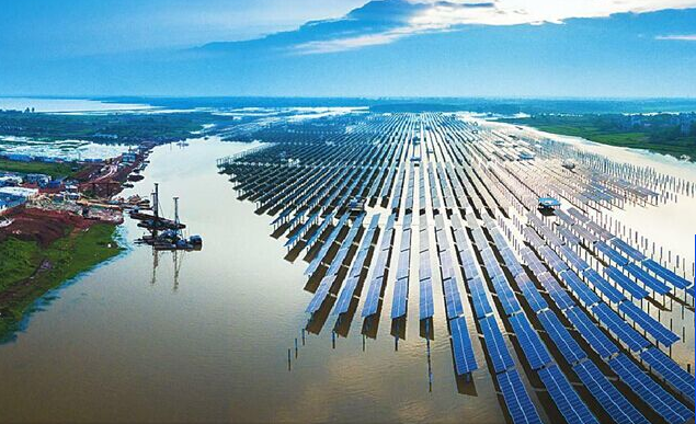 波光粼粼的水面上,48萬(wàn)塊成片橫豎成行、整齊排列的多晶硅光伏板在陽(yáng)光的映襯下泛著藍(lán)光,蔚為壯觀。今年5月,在江西鄱陽(yáng)縣饒豐鎮(zhèn)馬家村灌湖水庫(kù)和楓林水庫(kù)水域,亞洲最大單體獨(dú)立式12萬(wàn)千瓦、占水地面積約3000畝的饒豐漁光互補(bǔ)光伏電站正式建成,并并網(wǎng)發(fā)電。