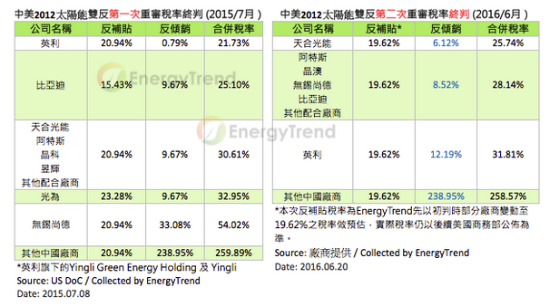 2012年中美雙反第二次重審之反傾銷終判出爐,反補貼稅率需待七月中公布。TrendForce旗下新能源事業(yè)處EnergyTrend觀察,反傾銷稅率與初判幾無差異,天合光能仍為最大贏家;相較之下,臺廠茂迪則早于去年底之重審初判失去稅率優(yōu)勢,出貨美國的間接訂單量、價在這半年來已持續(xù)走弱。