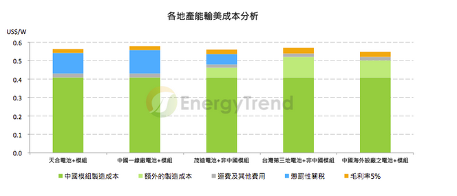 展望未來,由于越來越多的中國第三地電池與組件新產(chǎn)能成熟,以中國自身第三地產(chǎn)能出貨的利潤也較佳,將會有更多的輸美訂單采取第三地出貨的模式。若以反傾銷稅率終判、反補貼稅率初判19.62%的關(guān)稅來估算成本,目前采取各種方式的成本差異不大,中國廠商可視自身產(chǎn)能狀況調(diào)整輸美策略。由于第三季中國內(nèi)需冷清,預估中國主要廠商還是會持續(xù)維持部分本土產(chǎn)能供應美國需求,在各市場價格都持續(xù)跌落的狀況下,美國作為目前毛利潤較高的市場,預估后續(xù)價格也將慢慢壓縮,會從目前的US$0.58-0.6/W跌至年底約在US$0.55/W左右。