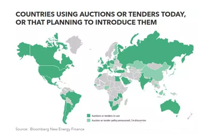 以下是我們獲得的幾組數(shù)據(jù): 根據(jù)彭博新能源財經(jīng)的《新能源展望》,2040年前,目前已經(jīng)引入競拍或投標(biāo)機制的國家每年將迎來25%到35%的新增清潔能源電力容量(小規(guī)模光伏機組除外);