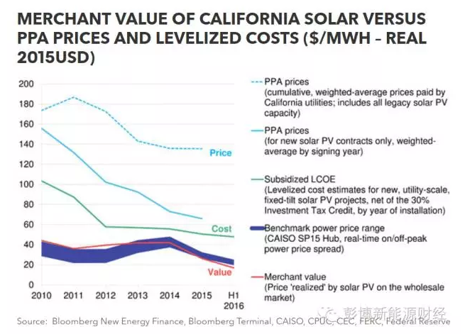 由于加利福尼亞州的太陽能發(fā)電項目已經(jīng)通過長期購電協(xié)議保障了自己的利潤。因此,對這部分現(xiàn)有項目而言,這些因素都并不重要。當(dāng)?shù)氐拇蠖鄶?shù)光伏容量所有者暫時無需面對批發(fā)電力市場的競爭,至少在合同到期之前是這樣。不過,當(dāng)合同到期后,這部分光伏容量將不得不直面低得可怕的商業(yè)利潤,(我們認(rèn)為)這部分利潤可能無法完全體現(xiàn)在對項目“剩余價值”的估計之中。2015年,加州光伏發(fā)電資產(chǎn)所有者拿到的加權(quán)平均購電協(xié)議價格為$136/MWh(由電廠支付),而新合同中規(guī)定的電價僅為$66/MWh。不過,這兩個價格均仍遠(yuǎn)高于批發(fā)電價。