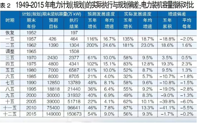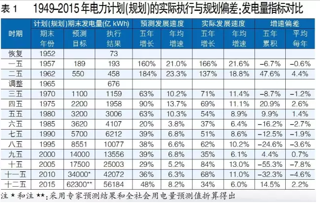 3、規(guī)劃結(jié)果誤差偏大。(詳見表1和表2)1949年-2015年,我國實施了12個5年計劃(規(guī)劃),根據(jù)國民經(jīng)濟體制的發(fā)展變遷,將上述數(shù)據(jù)分為3組,可以發(fā)現(xiàn)在不同的歷史階段,電力規(guī)劃的預(yù)測與執(zhí)行偏差情況有各自的特點:
