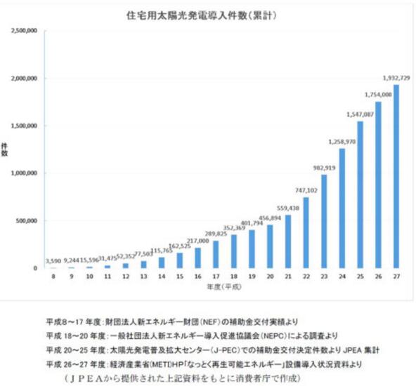 圖1:住宅用光伏發(fā)電系統(tǒng)的設(shè)置數(shù)量達(dá)到約193萬套