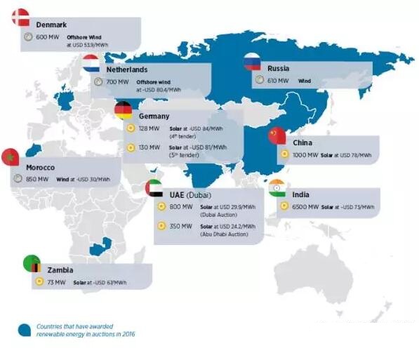 國際可再生能源署(IRENA)日前發(fā)布報告,盤點2016年各國風電、光伏的最低報價。