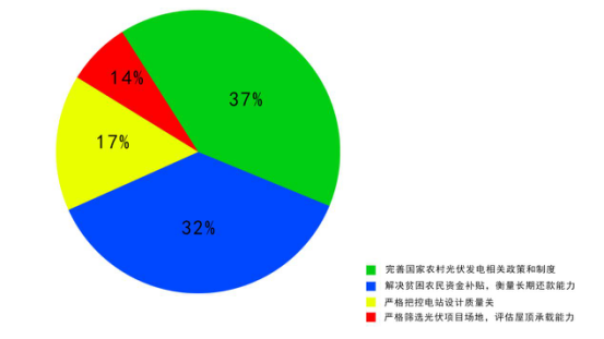 近日,中國(guó)電力新聞網(wǎng)、中電傳媒微博微信論壇通過(guò)微話題征集活動(dòng),發(fā)布調(diào)查問(wèn)卷,就推進(jìn)農(nóng)村光伏發(fā)電廣泛征集意見(jiàn)。調(diào)查結(jié)果顯示,有17%的受訪人群認(rèn)為,推進(jìn)農(nóng)村光伏發(fā)電要嚴(yán)格把控電站設(shè)計(jì)質(zhì)量關(guān);37%的受訪人群認(rèn)為,需要完善農(nóng)村光伏發(fā)電相關(guān)政策和制度;14%受訪人群認(rèn)為,嚴(yán)格篩選光伏項(xiàng)目場(chǎng)地,評(píng)估屋頂承載能力;32%受訪人群認(rèn)為,需要解決貧困農(nóng)民資金補(bǔ)貼,衡量長(zhǎng)期還款能力。
