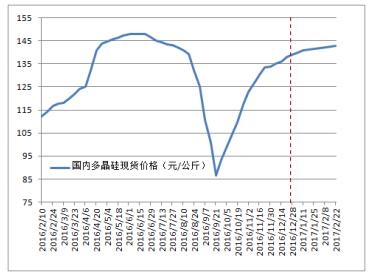 圖1 2016年2月-2017年2月國(guó)內(nèi)多晶硅現(xiàn)貨價(jià)格 來(lái)源:硅業(yè)分會(huì)