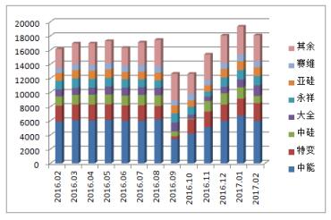 圖2 2016年2月-2017年2月國(guó)內(nèi)多晶硅分企業(yè)產(chǎn)量 單位:噸 來(lái)源:硅業(yè)分會(huì)