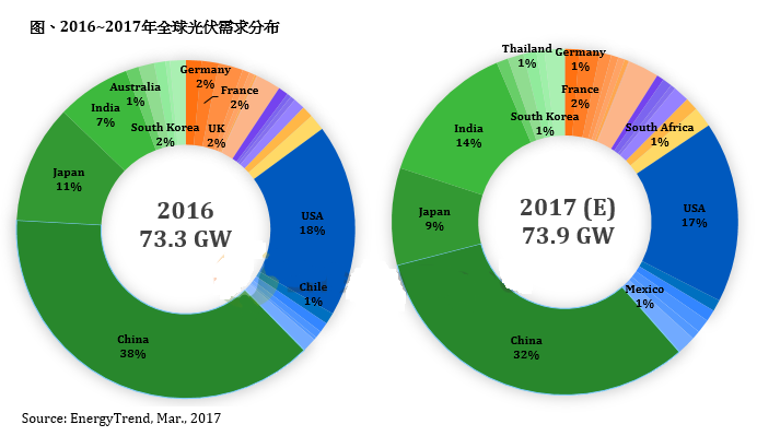 EnergyTrend分析師蔡旻純表示,由于中國目前公布之2017年光伏裝機(jī)目標(biāo)略低于去年,加上美國政策恐不利于光伏發(fā)展、日本躉購費(fèi)率(Feed-in-Tariff)持續(xù)下調(diào)等因素,讓需求強(qiáng)勁成長中的印度有望取代日本成為需求第三大國,占全球比重達(dá)14%。