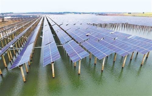 這是3月16日拍攝的江西奉新“漁光互補”光伏發(fā)電一期項目。近日,坐落于江西省宜春市奉新縣躍進水庫上的泰明“漁光互補”光伏發(fā)電項目一期35兆瓦光伏電站建成投運。該項目總投資12億元,總裝機容量110兆瓦,上層用于光伏發(fā)電,下層用于水產(chǎn)養(yǎng)殖,提高了單位面積土地和水域的經(jīng)濟價值。新華社記者 萬象 攝