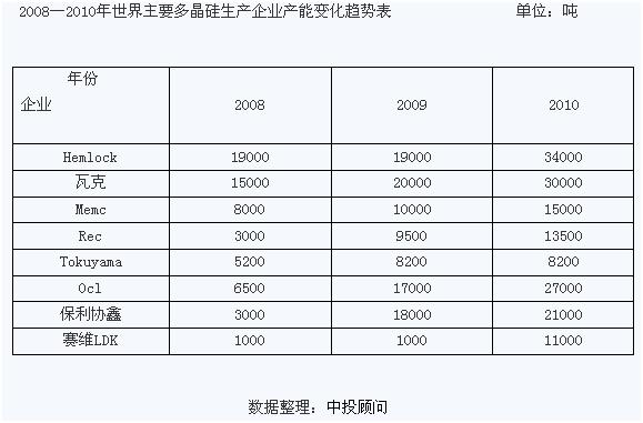 2010年是世界多晶硅行業(yè)的一輪黃金發(fā)展期,許多新興的多晶硅廠商逐漸成長起來,漸漸打破了世界多晶硅行業(yè)完全由傳統(tǒng)七大巨頭壟斷的局面。尤其值得關(guān)注的是,國內(nèi)光伏企業(yè)紛紛擴(kuò)充多晶硅產(chǎn)能,目前超過萬噸產(chǎn)能的就有保利協(xié)鑫旗下的江蘇中能(2.1萬噸)和賽維LDK(1.1萬噸),中國多晶硅生產(chǎn)企業(yè)在國際市場上的競爭力逐漸增強(qiáng)。