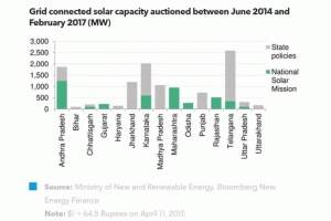 印度的光伏價格正在持續(xù)下降。2016年的最低光伏電價為每度電4.34盧比(折合$64.1 per MWh)。2017年2月,光伏電價繼續(xù)下跌至每度電3.31盧比(折合$49.38 per MWh)。2017年4月11日,Engie公司甚至創(chuàng)下了每度電3.15盧比(折合$48.48 per MWh)的光伏電價新低。