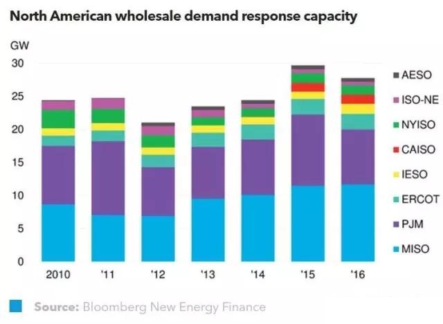 2016年,北美電力批發(fā)市場(chǎng)中的需求響應(yīng)容量規(guī)模