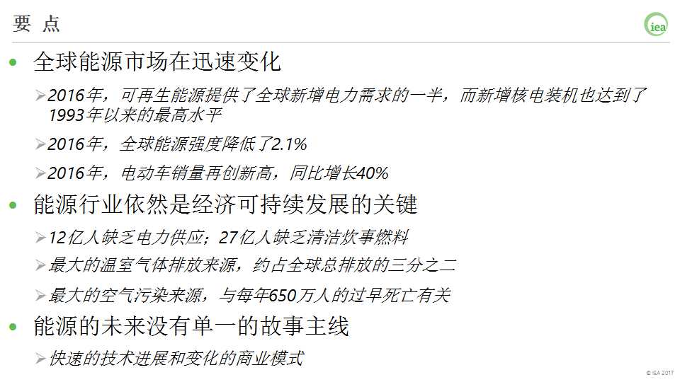 《巴黎協(xié)議》已被全球144個國家批準,這其中包括了大部分的IEA 成員國。這表明能源利益相關(guān)者新的期望,設(shè)立了一個雄心勃勃的氣候減排目標,這將深刻影響能源行業(yè)的發(fā)展路徑。